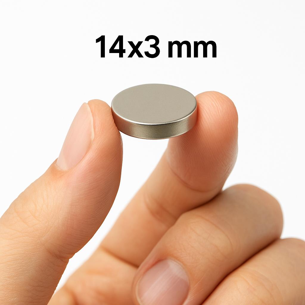 Ø14 mm çapında ve 3 mm kalınlığında üretilen bu süper güçlü neodyum mıknatıs, kompakt boyutuna rağmen yüksek manyetik performans sunar.