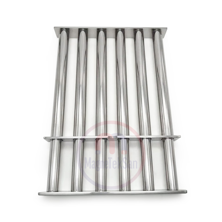 300x400 mm giriş elek mıknatıs seperatör ürünümüz kendi tesislerimizde üretilmektedir. Fabrikalarda ürün akışlarının çıkış borularına veya döküldüğü alanlara monte edilir. Bu sayede dökülen gıda, plastik, cam, seramik gibi ürünlerin içinden metaller çekilir. Havada görünmeyen metal tozlarını dahi çekebilen bu kare elek mıknatıslar firmanıza özel boyutlarda ve çekim güçlerinde imal edilebilir.