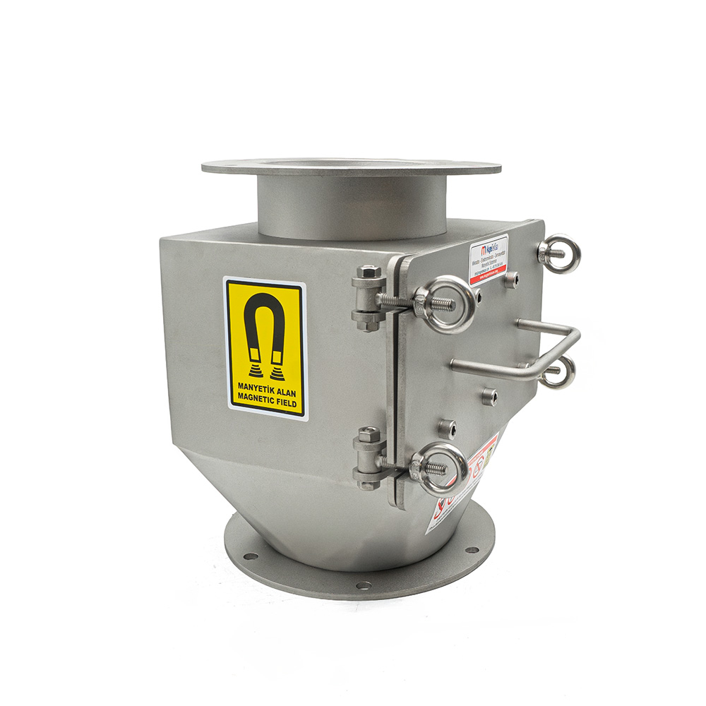 Bu manyetik sistem, gıdaya uygun AISI 304 veya AISI 316 paslanmaz çelikten imal edilmiştir. Hijyenik tasarımı sayesinde gıda sektörünün tüm gereksinimlerini karşılar. DN100 flanşlı giriş ve çıkış bağlantıları, üretim hatlarına kolay entegrasyon sağlar. Kolayca çıkarılabilir çekmece tipi mıknatıs modülü, temizlik ve bakım işlemlerini hızlı ve pratik hale getirir.
