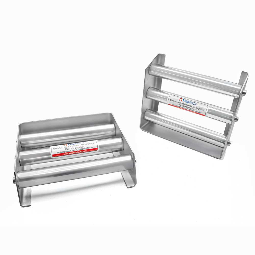The 150x150 mm S882T neodymium grid magnet is a compact yet powerful magnetic separator equipped with 3 pieces of Ø25 mm high-strength neodymium bars. Designed for removing ferrous contaminants from powdered and granular materials in food, plastics, and chemical industries.