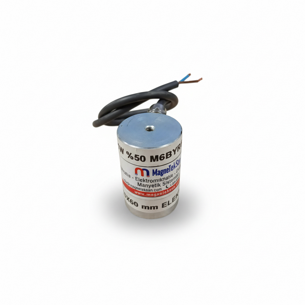 Ø40×60 mm 24V DC elektromıknatıs, uzun süreli manyetik tutma ve endüstriyel güvenilirlik gerektiren sistemlerde kullanılmak üzere tasarlanmış yüksek performanslı bir modeldir.