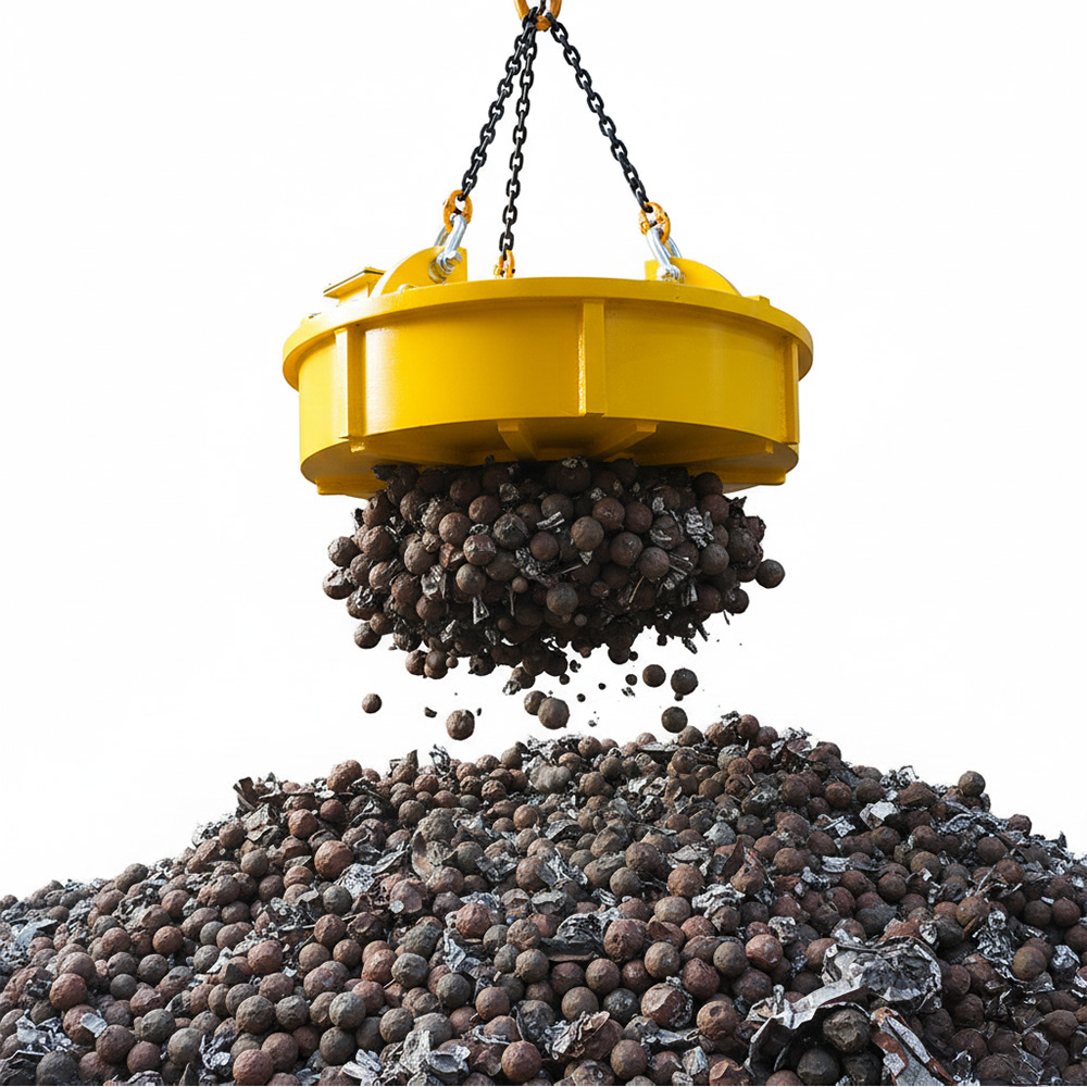 MGK-E-1350 model Ø1350 mm yüksek güçlü elektromıknatıs, sfero döküm hurdası gibi yoğun ve ağır metalleri güvenle kaldırmak için tasarlanmış profesyonel bir kaldırma ekipmanıdır. Endüstriyel hurdalama ve dökümhane operasyonlarında maksimum verim sunar.